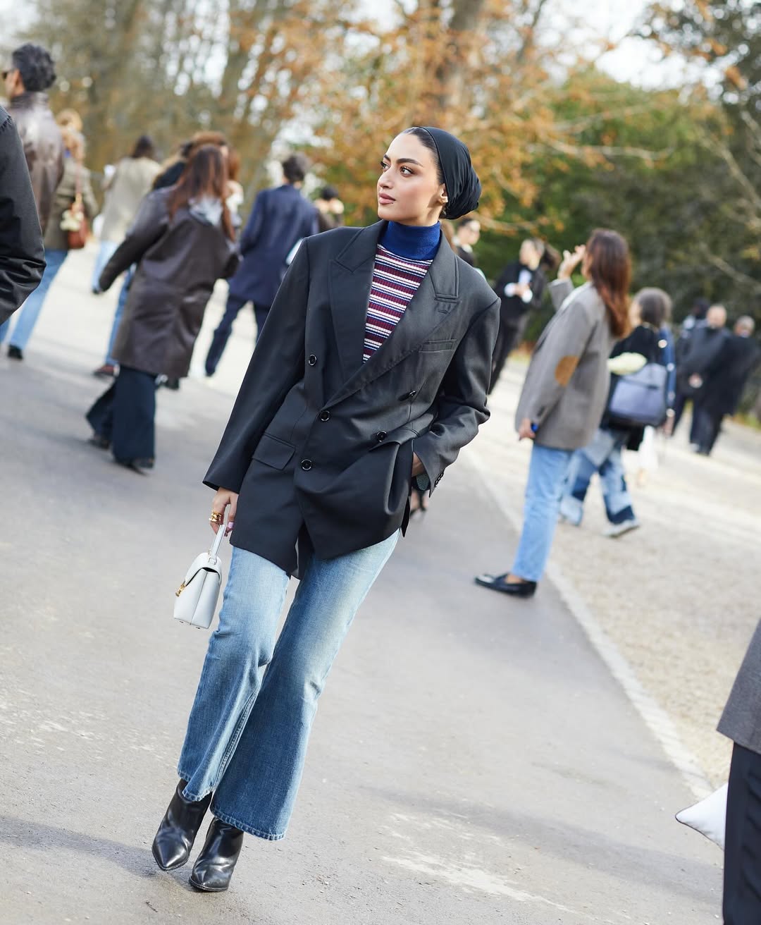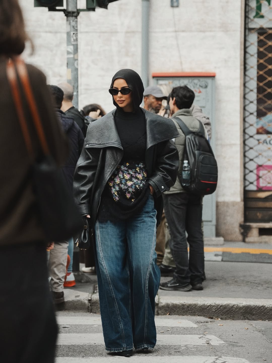 يواصل الجينز الواسع حضوره القوي ضمن صيحات الموضة، وهو من الخيارات المحببة للمحجبات لما يوفره من راحة وانسيابية، ينسجم هذا التصميم بشكل جميل مع البلوزات الفضفاضة أو القمصان الكلاسيكية، والجواكيت القصيرة، ويمكن تنسيقه مع حذاء رياضي لإطلالة يومية أو مع كعب بسيط لمظهر أكثر أناقة، وقد نسقته سهى طه مع كنزة سوداء وجاكيت جلد أسود بقصّة واسعة.