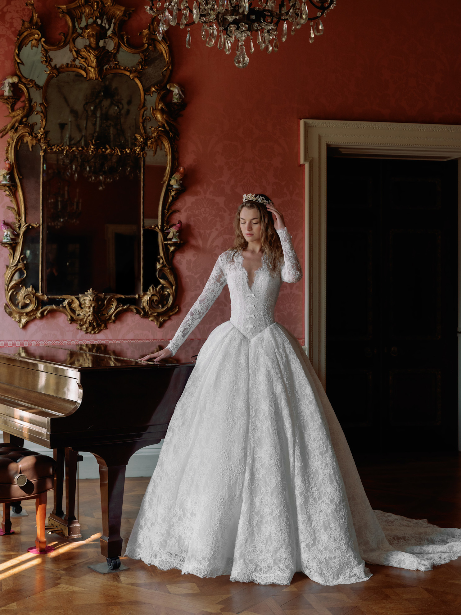 في مجموعة ماركة فرانشيسكا ميراندا Francesca Miranda لم تأت قصة الكورسيه منفصلة عن التنورة مثل أغلب الموديلات التي صادفناها في مجموعة خريف وشتاء 2026، فقد اتصلت بالتنورة المنسابة على الجسم وزودت من أعلى بتوب طويل أكمام مرتفع الياقة ليحاكي ذوق عروس ترغب في إطلالة محتشمة، اكتفي بتنسيقه مع أقراط Studs مرصعة باللؤلؤ والألماس، وانتعلي حذاءً مدبباً مصمماً من الدانتيل المرهف.