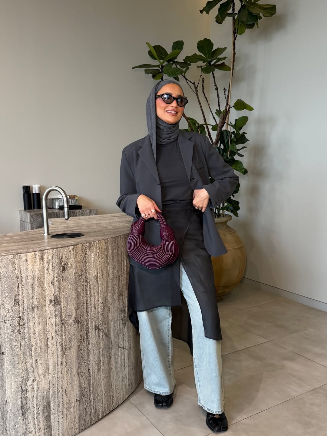 يعد الجينز ذو القصّة المستقيمة من أكثر الخيارات ملاءمة للمحجبات، بفضل تصميمه الذي ينسدل بانسيابية دون أن يحدد تفاصيل الجسم، يمكن تنسيقه بسهولة مع القمصان الطويلة أو التونيك، كما يضفي البليزر أو الكارديغان الطويل لمسة من الأناقة العملية، إنه خيار مثالي لإطلالات يومية أنيقة أو حتى للطلعات مع الأصدقاء، وفي العمل، وهنا نسقت دلال الدوب الجينز المستقيم مع بليزر داكن لإطلالة شبه رسمية.